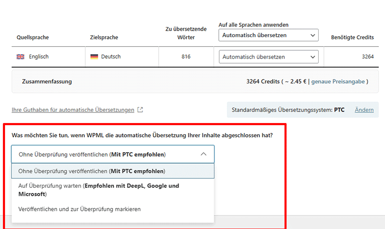 Früher waren andere Plugins WPML dahingehend überlegen, weil sie eine One Click Übersetzung der Inhalte ermöglichten. Seit der Version 4.5 lassen sich neue Inhalte automatisch übersetzen, prüfen und dann freischalten. Es muss keine Seite in der entsprechenden Sprache mehr angelegt werden. Alles wird von WPML automatisch übersetzt. Als Basis für die Übersetzung werden die verfügbaren Credits verwendet (siehe oben).