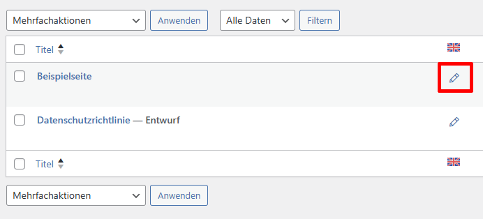 Nach dem Absenden wird dir noch kurz angezeigt, dass die Inhalte nun übersetzt werden. Nach einer Weile und einem Reload verschwinden die zu übersetzenden Seiten aus dem Dashboard. Sie erscheinen nun als alternative Sprachversion unter Seiten (oder Beiträgen, je nachdem, was du übersetzt hast) und können dort weiterbearbeitet werden über das Stift-Symbol.