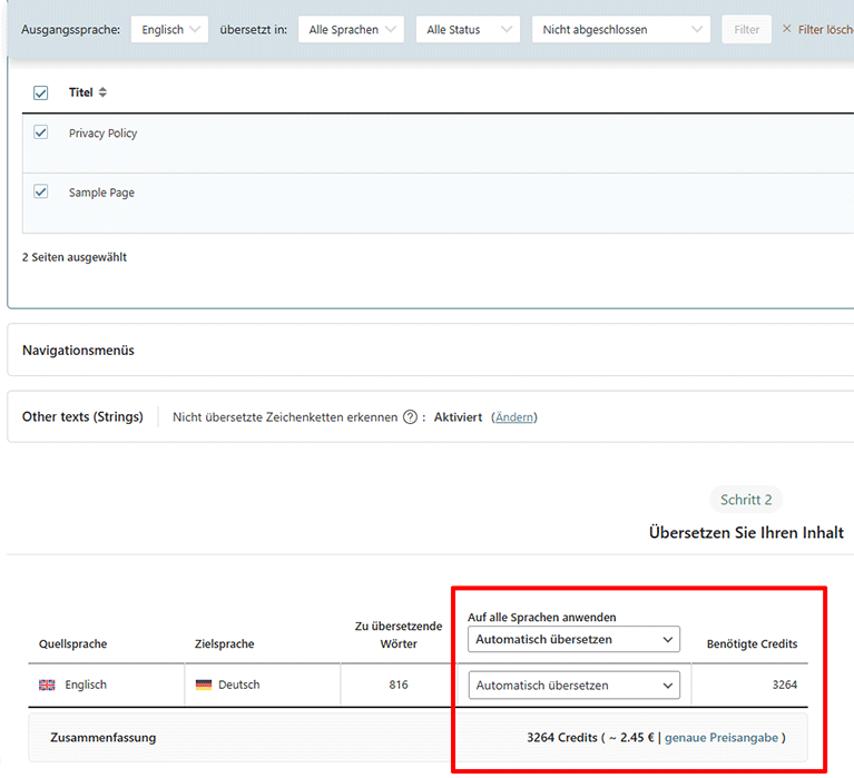 Nach der Auswahl der zu übersetzenden Seiten wird dir der Preis für die Übersetzung angezeigt