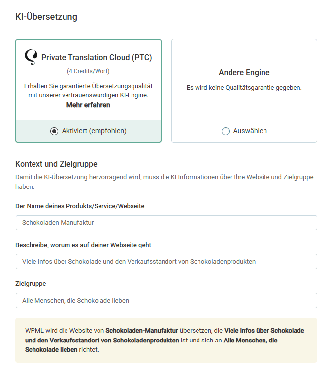 Hier wird vorgegeben, welche Übersetzungs-Engine verwendet wird und wie der generelle Kontext deiner Website lautet.