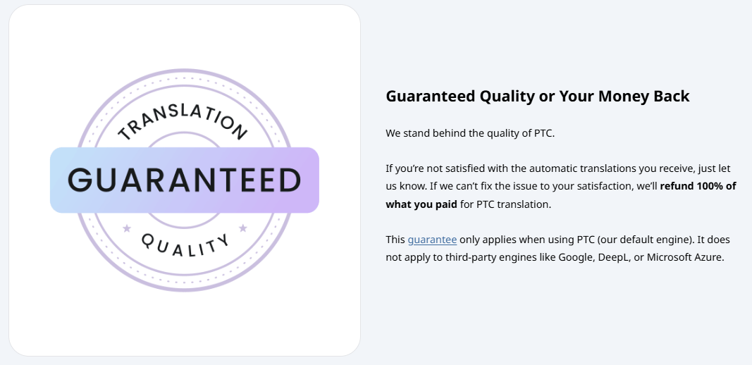 Für PTC-Übersetzungen gibt es eine Qualitäts- bzw. Geld-zurück-Garantie, falls du mit der Übersetzungsqualität nicht zufrieden bist. - Hintergrund-Automatisierung